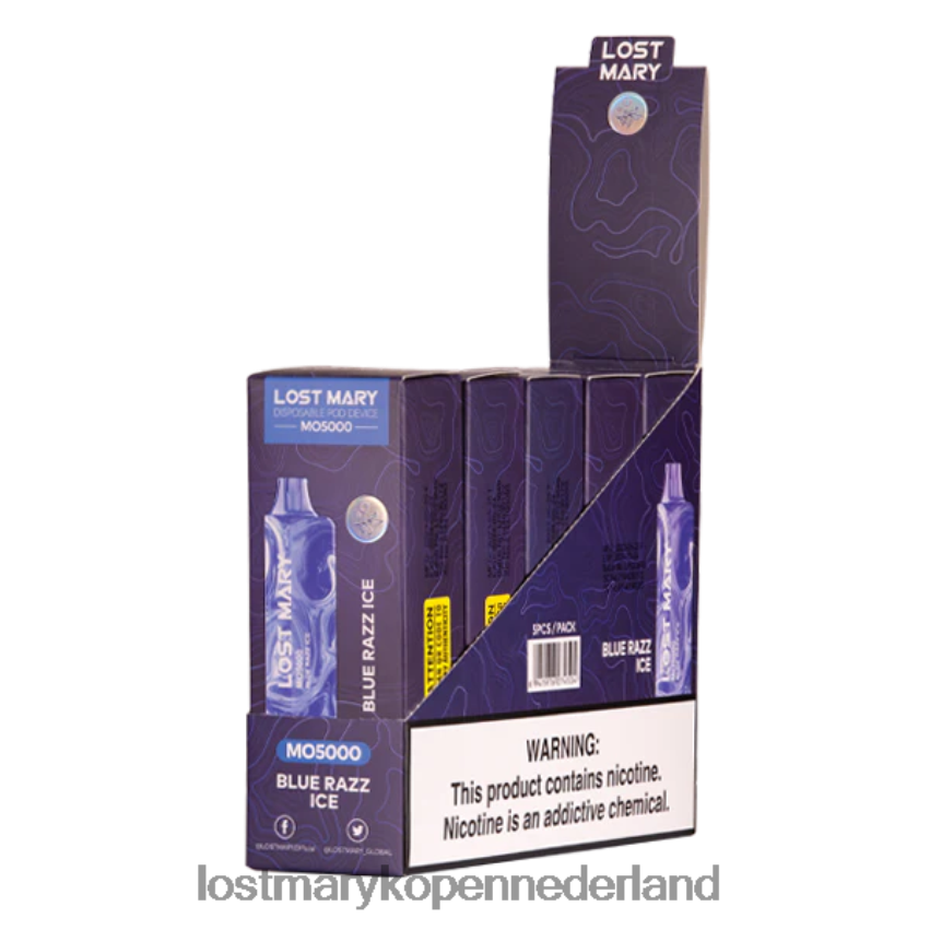 smaak: de Blue Razz Ice Lost Mary Mo5000 oplaadbare vape combineert de bekende gezoete frambozen- en bosbessenmix met een huiveringwekkende muntsmaak.